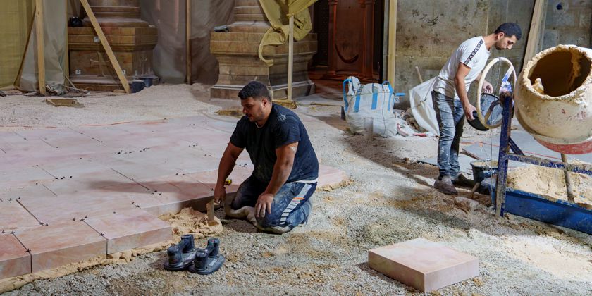 Auf dem Vorplatz der Grabeskirche – in der Altstadt von Jerusalem – sind die schweren rosafarbenen Platten und verschiedenste Gerüste gestapelt, die für die Arbeiten im Inneren der Kirche bestimmt sind. Nach monatelanger Wartezeit haben endlich die Arbeiten zur Verlegung des (neuen) Bodenbelags begonnen, was den Beginn der letzten Phase eines vor über fünf Jahren begonnenen Restaurierungszyklus markiert.